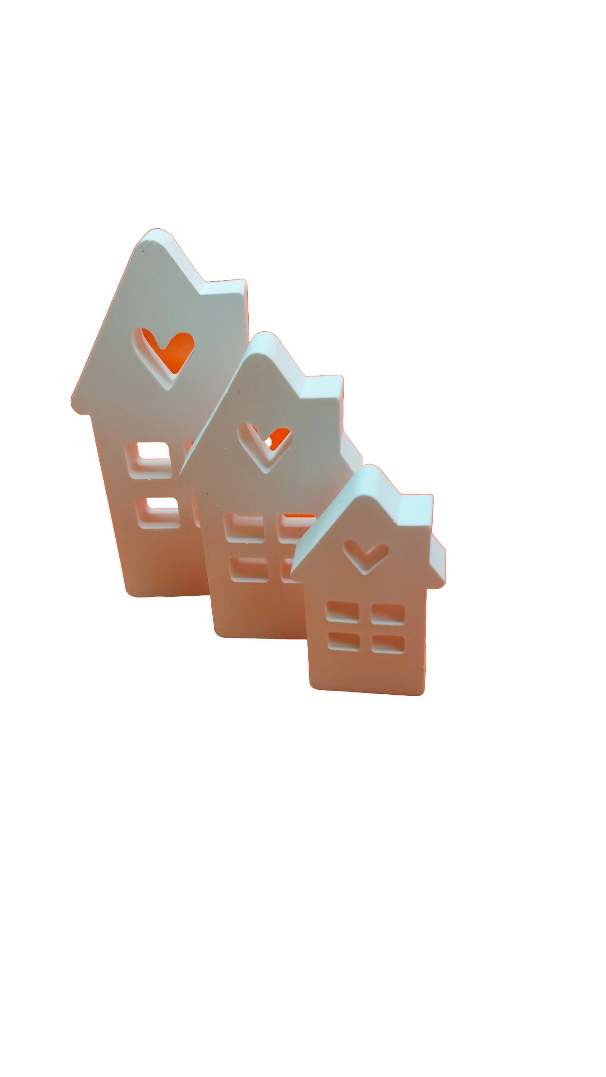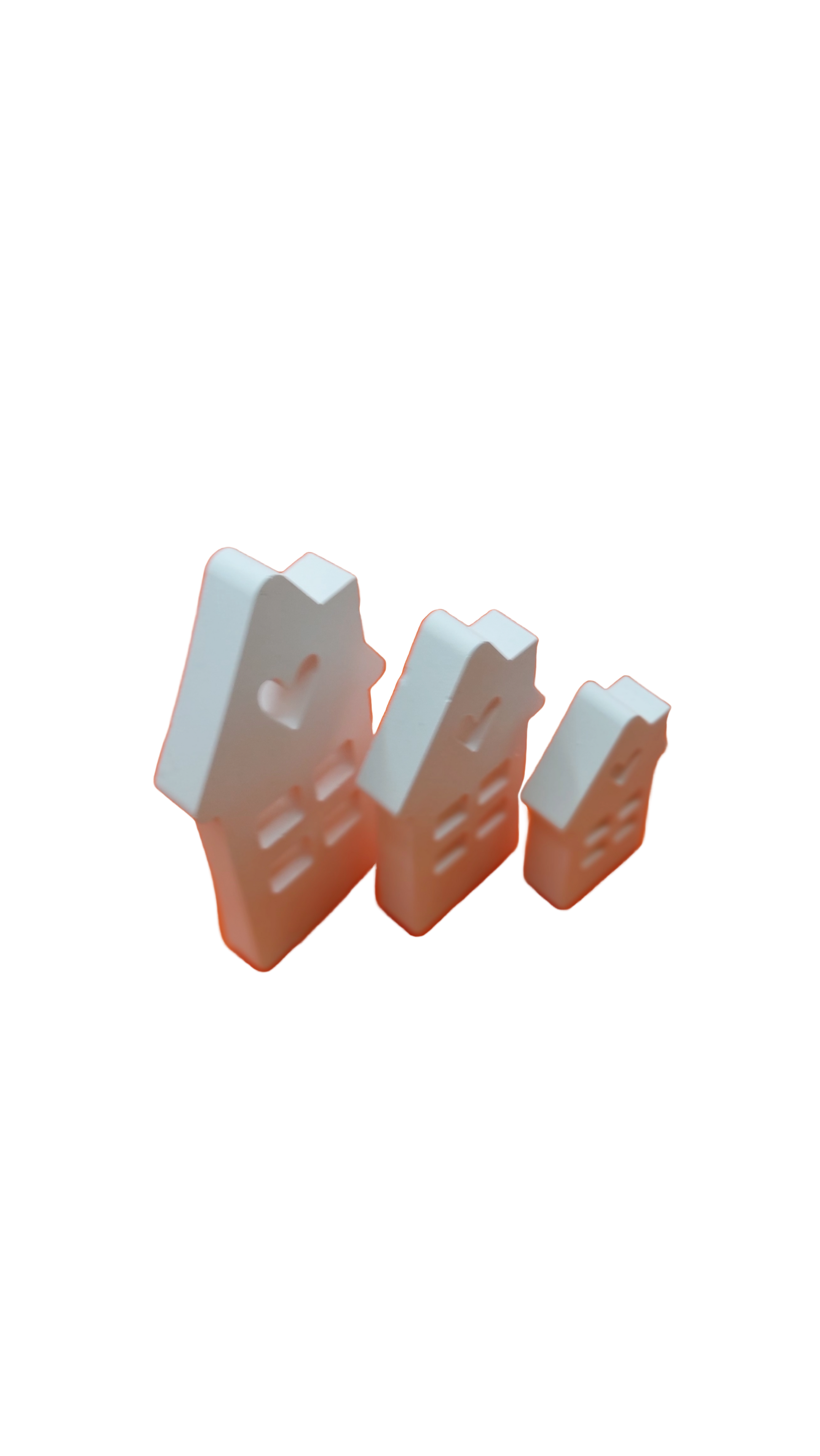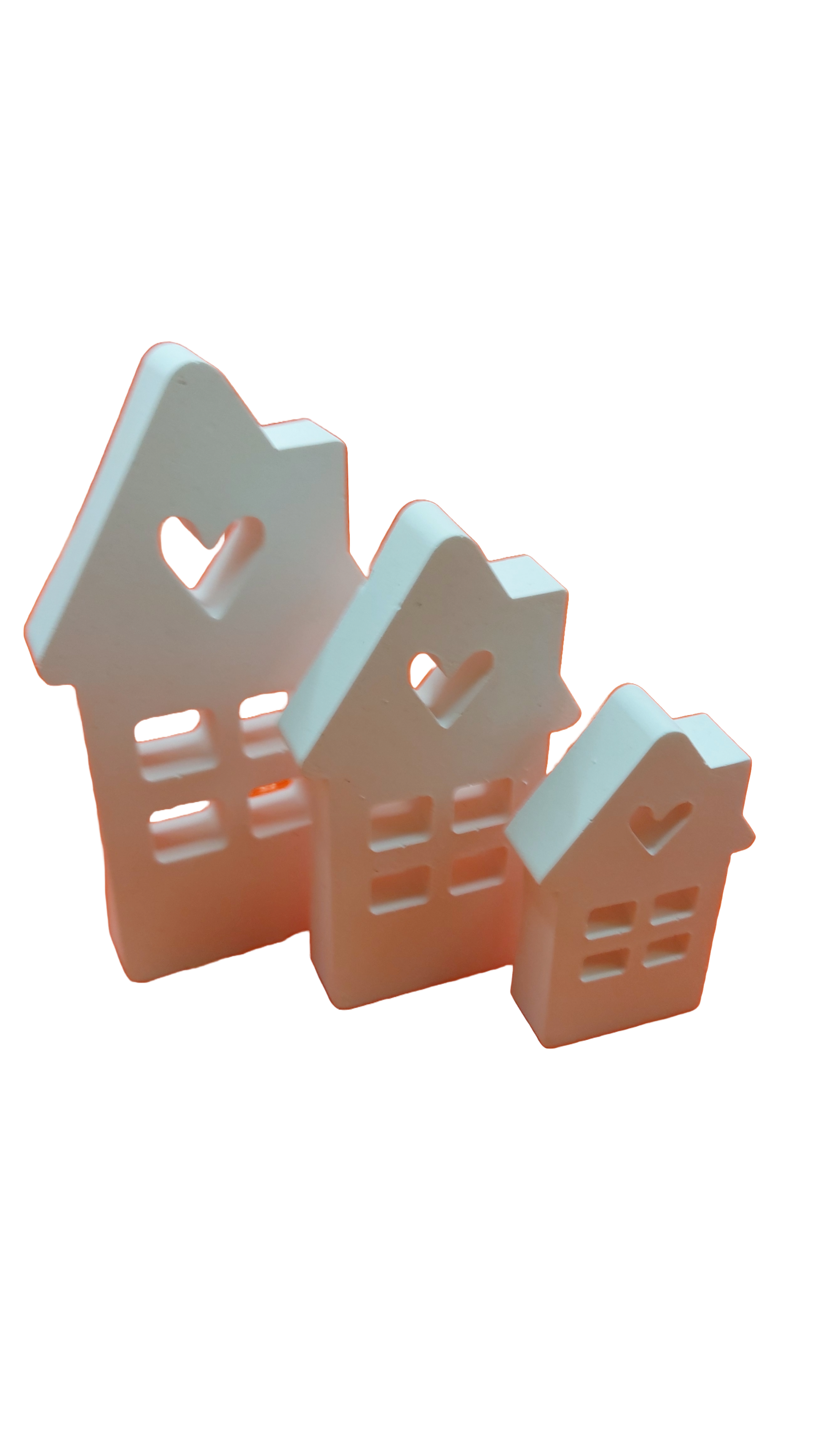 In schmaler Ausführung mit 3 Häusern mit Herz, Schornstein und 4 Fenstern.